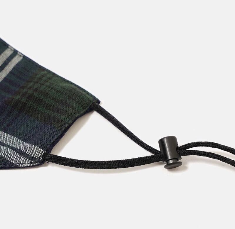 EZUMi 2020AWのオリジナルチェック生地を採用したface mask。立体的なパターンですが、鼻周りの凹凸感も何度もチェックし、フィット感と共に小顔効果のあるシルエットに仕上げました。両サイドにドローコードを片側2本使用し、スポーティなドローストリングで留めるようになっていて、ユニセックスで使用できるように長さ調節が可能。また、ドローストリングは軽いプラスチックにしており耳にあたる部分も柔らかく痛くならない仕様になっています。付属として、マスクと同生地のマスクケースがつきます。